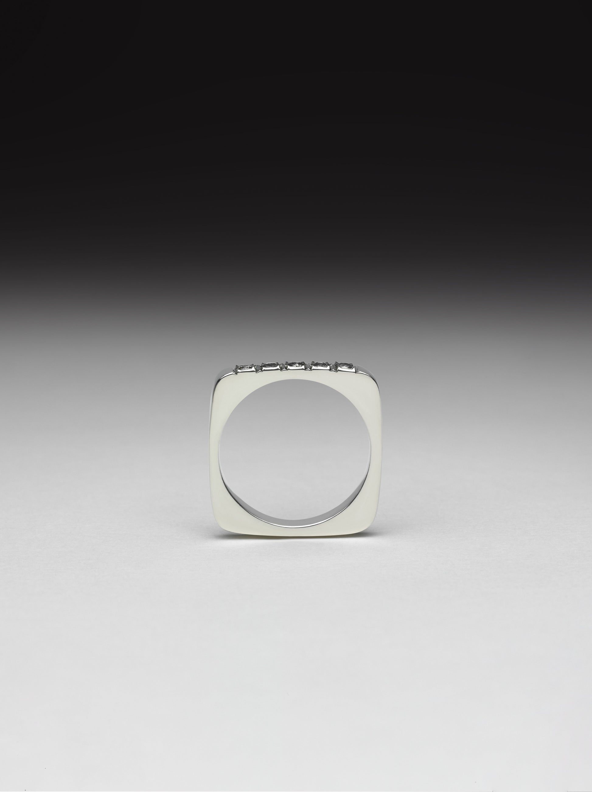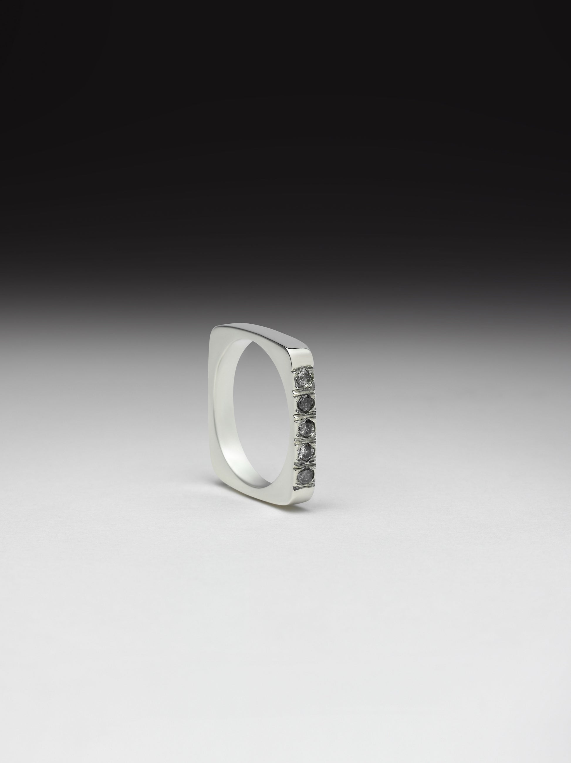 This ring, defined by its sculptural and geometric profile in polished sterling silver, features a series of natural salt and pepper diamonds that are seamlessly set along one side. Their unique speckled inclusions add a subtle, organic texture to the sleek metal. This piece is a captivating blend of modern lines and the raw, untamed beauty of the diamonds.