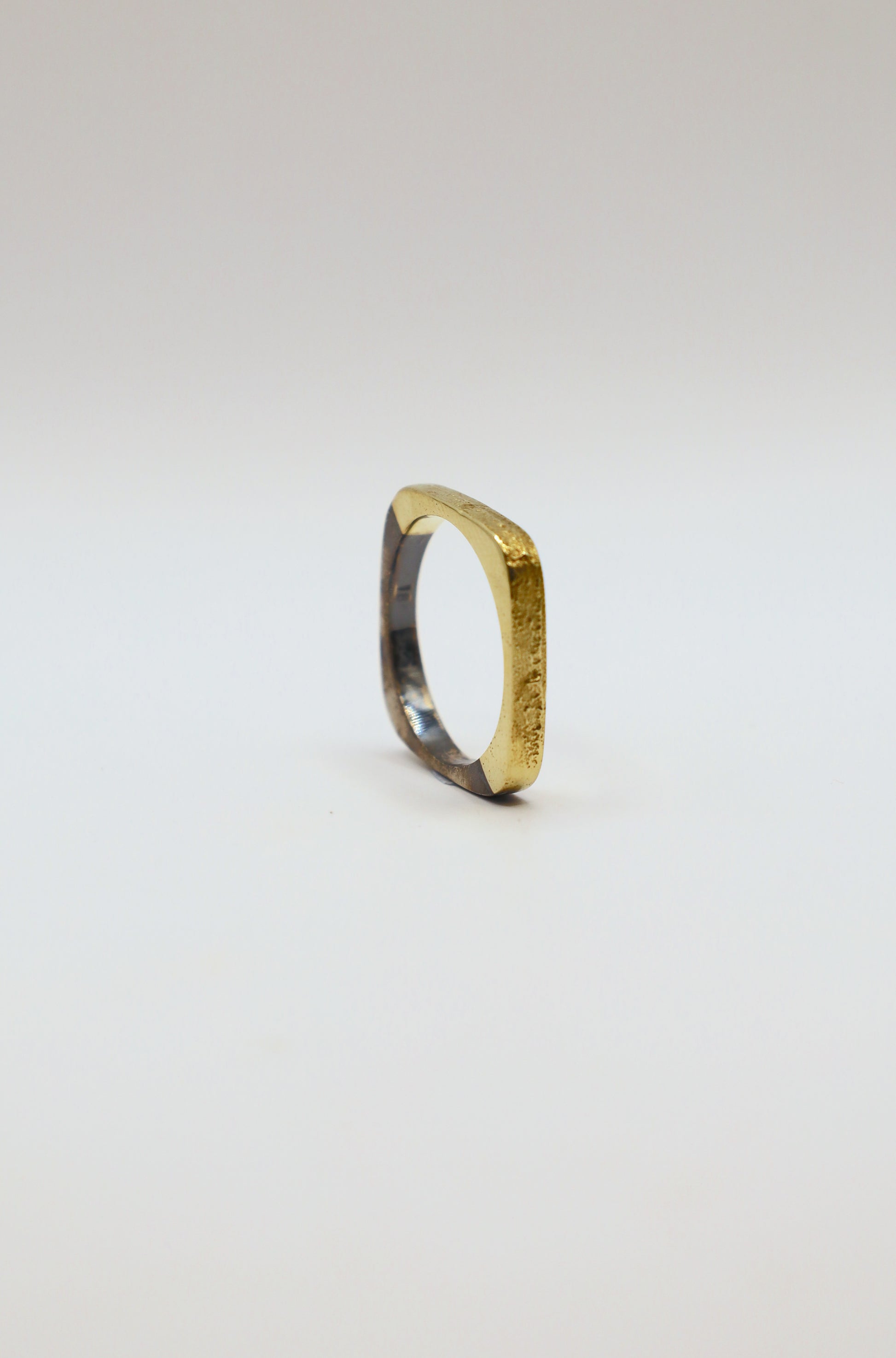 A dialogue between raw and refined: oxidised, lightly brushed sterling silver meets a section of 18k sand-cast gold, its green-yellow tone shaped by the irregular grain of the mold. The square silhouette brings the two materials into a calm equilibrium, the subtle gradient on the silver enhancing the way texture and form speak with understated elegance.