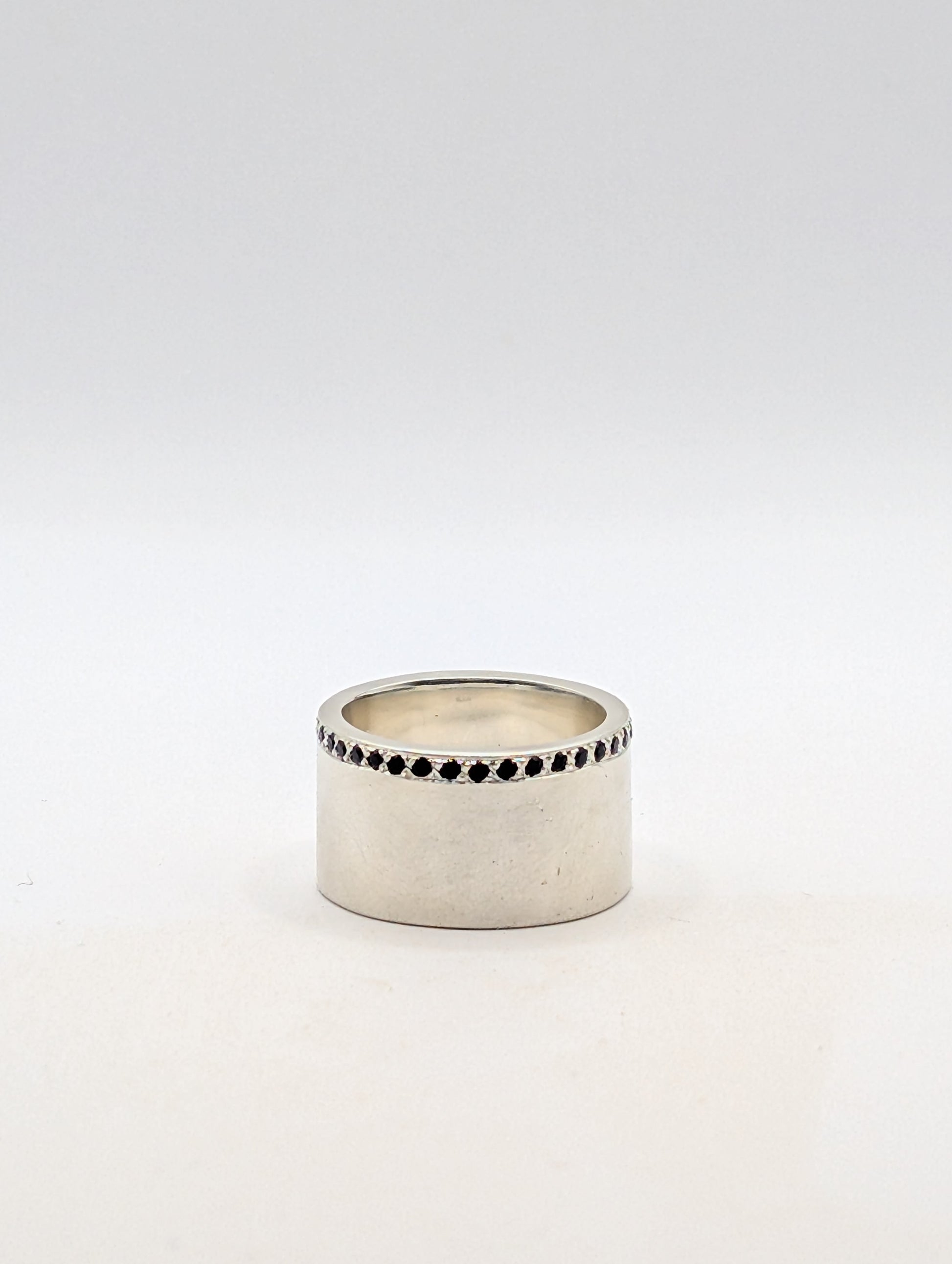 This wide sterling silver ring features a brushed finish and a row of natural black sapphires along the edge, adding an elegant line of dark sparkle.