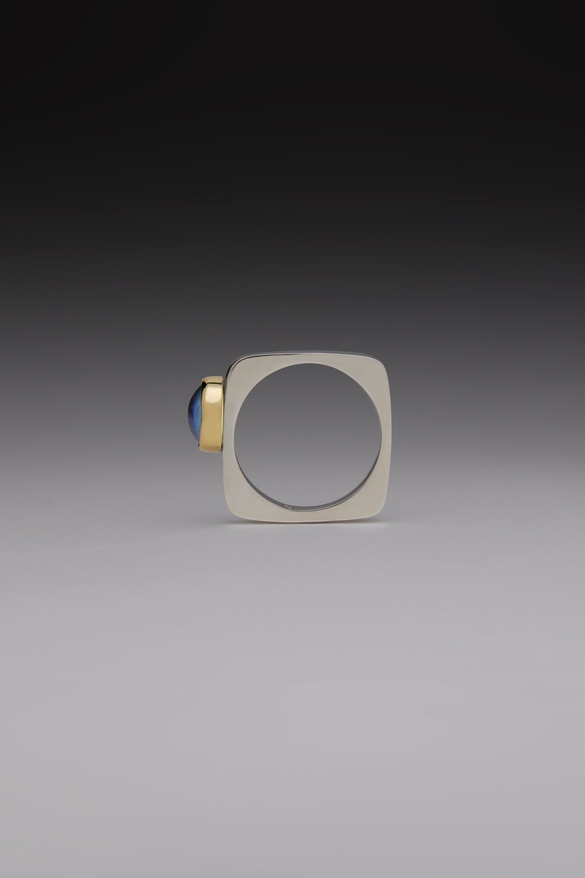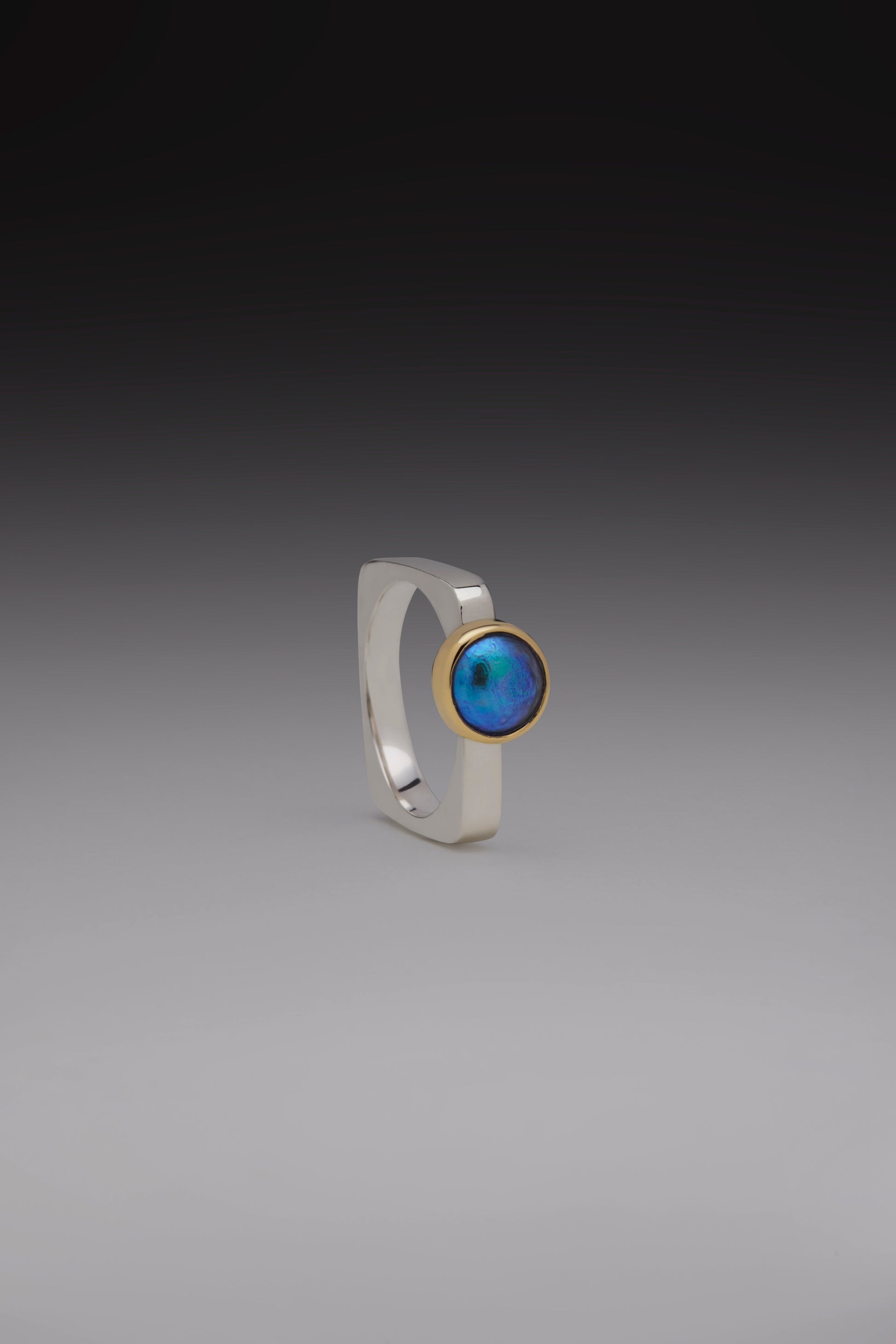A captivating modern design featuring a squared sterling silver band. The piece is highlighted by a gem-grade paua pearl, celebrated for its unique iridescence, which is set in a delicate 18ct gold bezel. The simple, clean lines and elegant combination of materials create a timeless piece.
